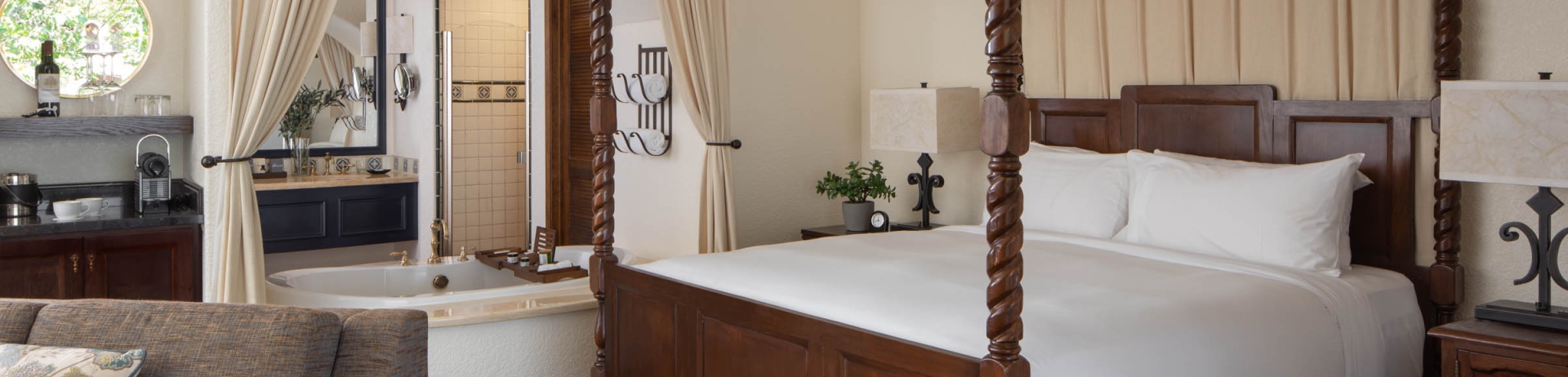Our Mission Spa Suites are our most romantic accommodations, boasting a open floor plan with oversized Jacuzzi soaking tub designed for two. The four-poster king bed, charming wood-burning fireplace and spacious sitting area offer a secluded sanctuary in the heart of Wine Country.